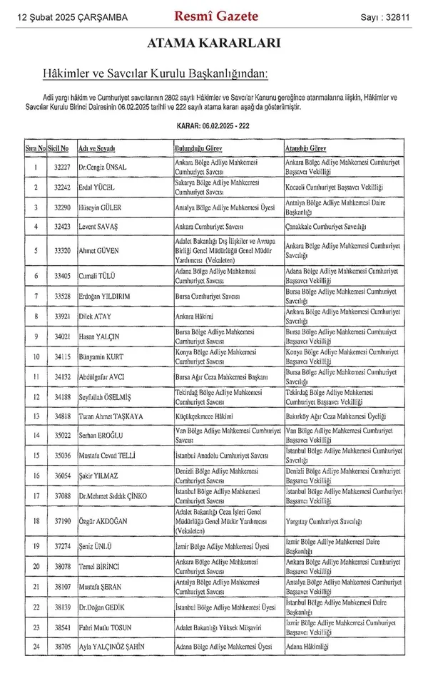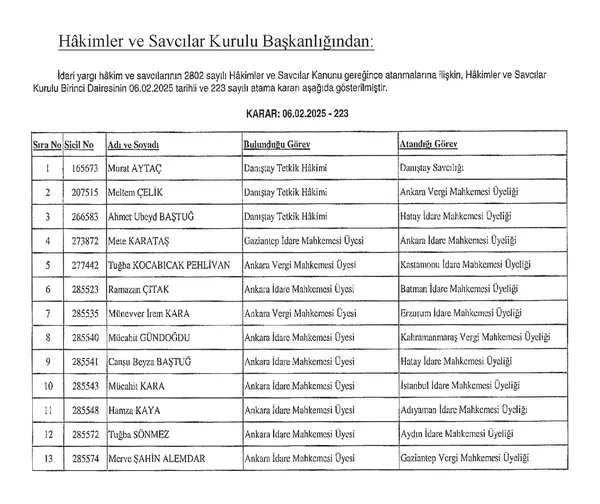 Hakimler ve Savcılar Kurulu’nun (HSK) atama kararnamesi ile 268 hakim ve savcının yeni görev yeri netleşti. Söz konusu kararname Resmi Gazete’de yayımlandı. İşte isim isim o liste…